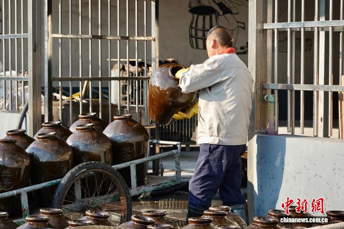 11月21日,酿酒师傅整理冬酿所需的酒坛。中新社记者 刘子琳 摄