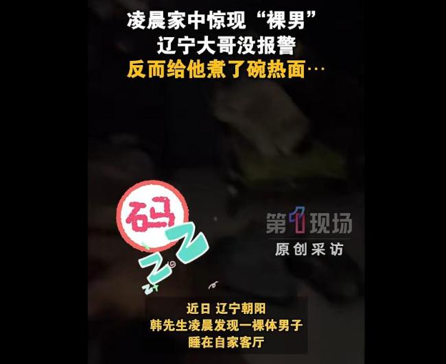 近日,辽宁朝阳的韩先生凌晨发现一名裸体男子睡在自家客厅。经了解,这名男子因醉酒走错门,还遗失了手机和外套,当时气温低至零下十几度。韩先生看到男子尚未完全清醒,担心他会冻死,决定帮助他。韩先生不仅给男子倒水煮面,还让他留宿了一晚。