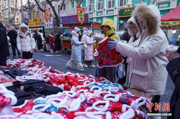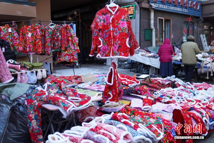 12月2日,黑龙江哈尔滨,各种东北特色花袄摆上街头售卖。当日,黑龙江哈尔滨最高气温今冬首次降到-10℃以下 ,在哈尔滨红专街早市,棉帽子、大花袄等保暖物品摆上街头,游人纷纷选购。中新社记者 赵宇航 摄