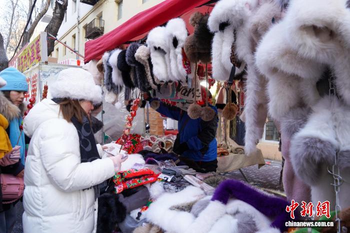 12月2日,黑龙江哈尔滨,商铺门口挂满保暖衣物。当日,黑龙江哈尔滨最高气温今冬首次降到-10℃以下 ,在哈尔滨红专街早市,棉帽子、大花袄等保暖物品摆上街头,游人纷纷选购。中新社记者 赵宇航 摄