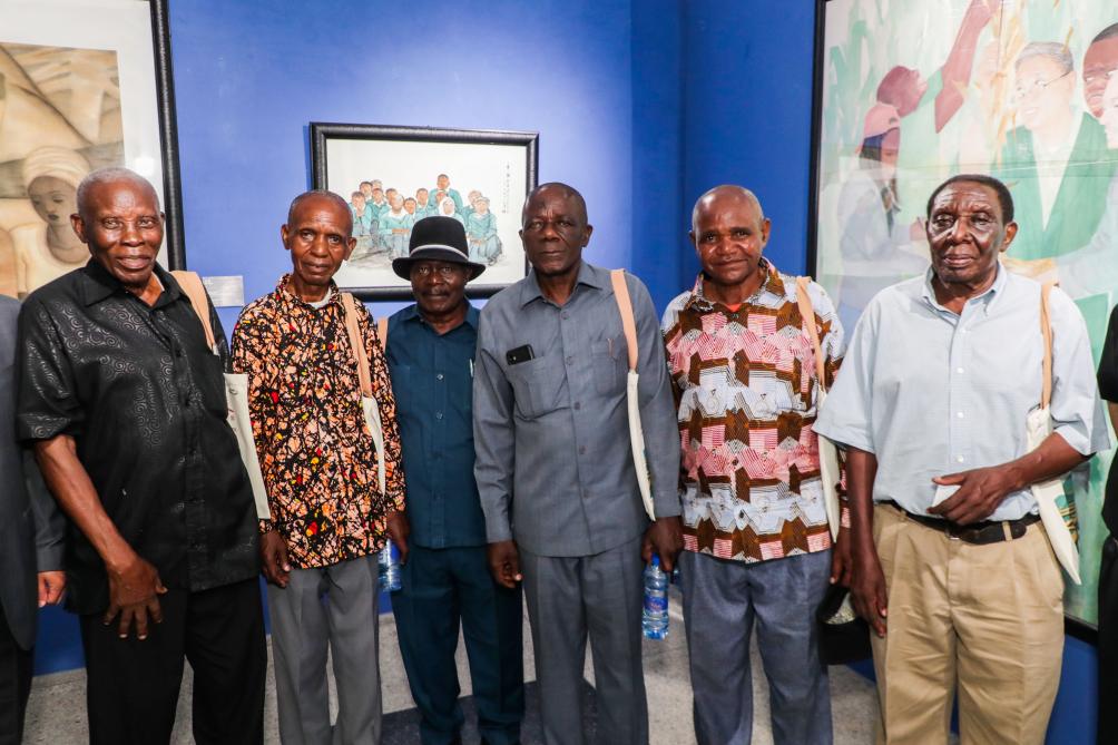 11月26日,在坦桑尼亚达累斯萨拉姆,坦赞铁路退休职工在“同路朋友——坦赞铁路采风绘画展”上合影。新华社发(赫尔曼·埃马纽埃尔摄)