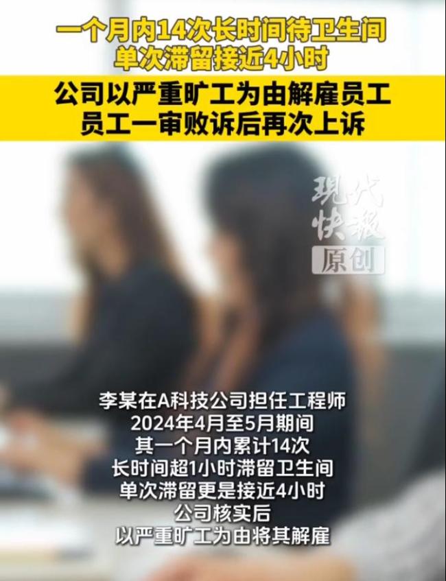 员工"带薪如厕"近4小时被解雇 长时间滞留引争议!员工李某因长时间“带薪如厕”被解雇,这一事件引起了广泛关注。苏州工业园区人民法院最近审理了此案。李某在一个月内14次长时间超过1小时滞留在卫生间,单次甚至接近4小时。A公司多次联系未果后,调取办公区监控核实情况,以严重旷工为由解除了与李某的劳动合同。