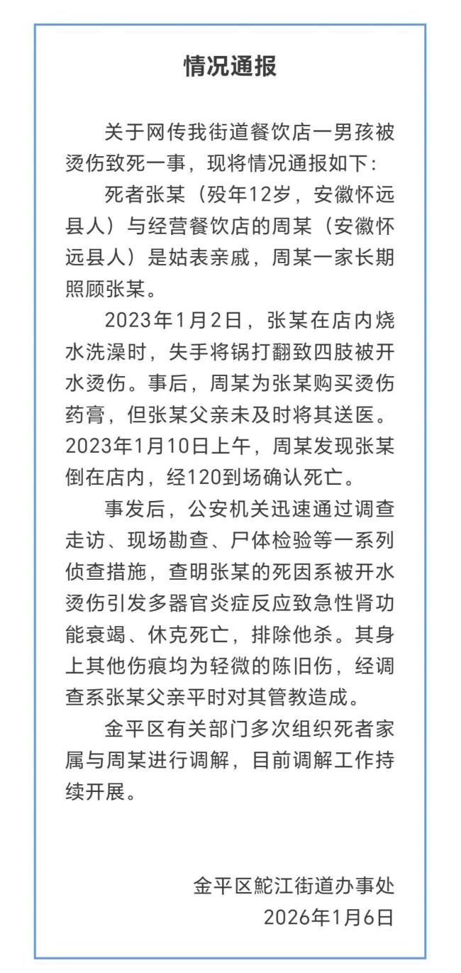 汕头12岁男孩被烫伤致死 家属与餐饮店老板调解未果。1月6日,广东汕头金平区鮀江街道办事处发布情况通报,回应网传该街道餐饮店一男孩被烫伤致死一事。