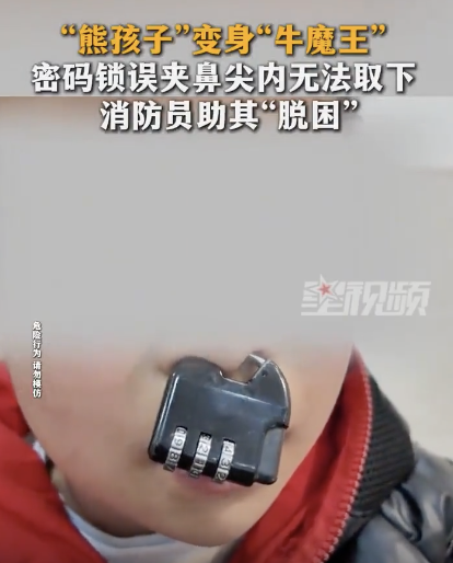 小孩用密码“锁”鼻 消防员:还玩吗?近日,湖南怀化。“熊孩子”变身牛魔王,男童将密码锁夹鼻尖内无法取下,消防员一分钟助其“脱困”。提醒家长朋友们:儿童安全无小事,家长需要时刻绷紧安全弦,小朋友们也要注意远离危险,安全第一!