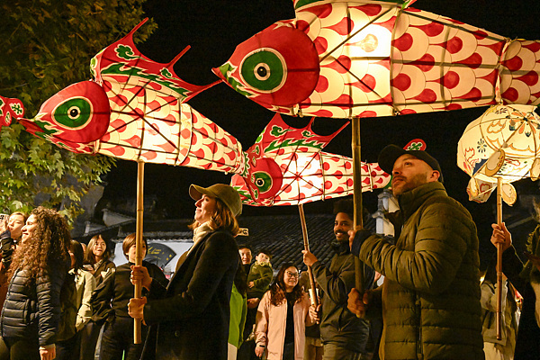 安徽黄山,游客可以手持鱼灯,参与到鱼灯巡游的队伍。或是在老师的指导下,亲手绘制鳞片,制作一个属于自己的鱼灯。