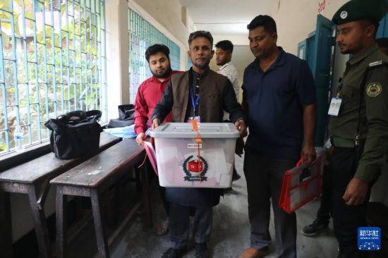 2月12日,在孟加拉国首都达卡,选举工作人员在投票站运送票箱。新华社发(哈比卜·拉赫曼摄)