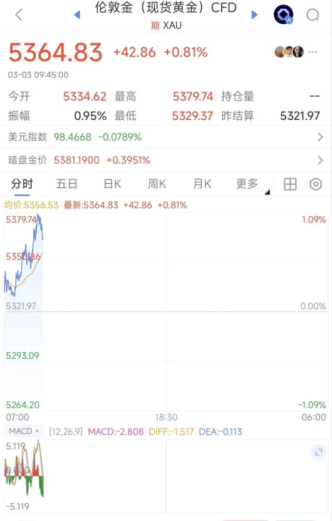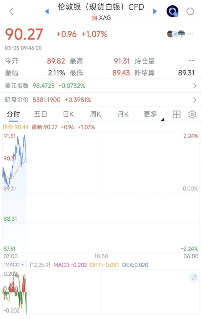 3月3日,现货金银周二高开反弹,截至发稿,现货黄金涨0.81%报5364.83美元/盎司,现货白银反弹,日内涨幅扩大至1.07%左右,报90.27美元/盎司。截至发稿,白银现货站稳90美元关口。3月2日晚间,现货白银价格直线闪崩,一度跌超7%,现货黄金也上演了跳水行情,一度跌破5300美元/盎司。(责任编辑:zx0600)