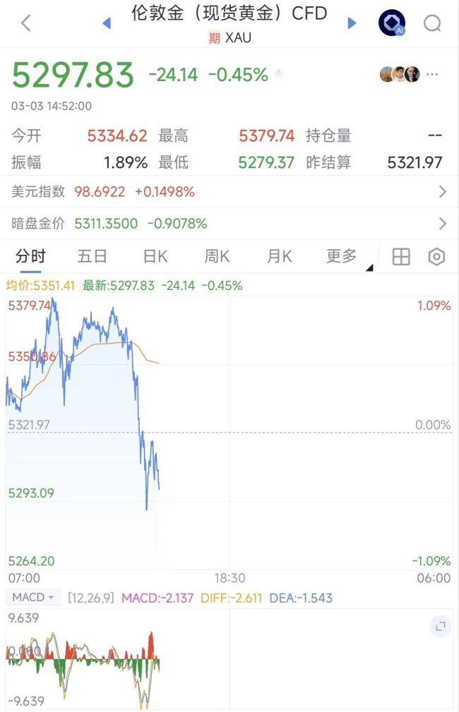 3月3日午后,黄金白银双双跳水,由涨赚跌,截至发稿,现货白银向下跌破85美元/盎司,日内下跌5.65%,伦敦黄金现货跌0.45%,跌破5300美元/盎司。黄金白银的跳水,或许跟美元指数有关,2日晚美元指数大涨超1%,截至3月3日14:10,美元指数继续上涨,逼近99关口。(责任编辑:zx0600)