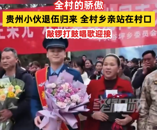 3月2日。贵州从江。据贵阳晚报最黔沿报道,从江小伙黄云龙退伍返回老家,全村的乡亲们站在村口迎接,敲锣打鼓唱歌欢迎黄云龙回家。
