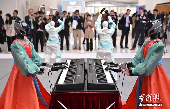 3月25日,2026中关村论坛年会在北京开幕。图为当天在论坛年会主会场,机器人乐队吸引嘉宾。中新社记者 赵文宇 摄