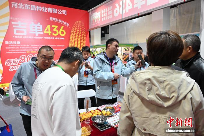 3月26日,内蒙古呼和浩特市,展商介绍玉米种子。中新社记者 刘文华摄