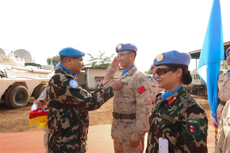 人民网内罗毕3月25日电(记者黄炜鑫)当地时间3月25日,联合国阿卜耶伊临时安全部队(联阿安全部队)向中国第二批赴阿卜耶伊维和快反分队150名官兵授予联合国“和平荣誉勋章”,以表彰他们在执行维和任务期间的优异成绩和为维护阿卜耶伊和平事业作出的突出贡献。