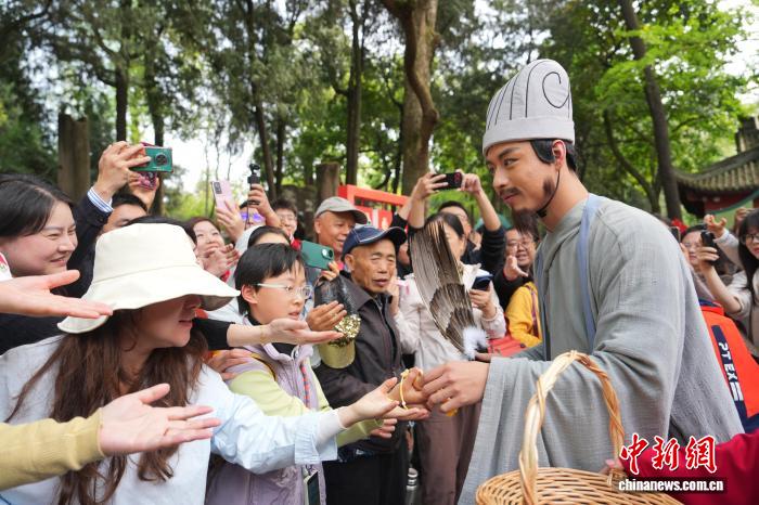 4月1日,四川成都,“诸葛亮”扮演者向游客送福袋。中新社记者 安源 摄