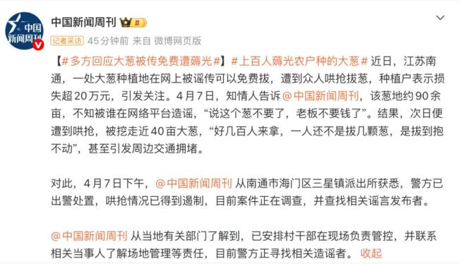 近日,在江苏南通,一处大葱种植地因网络谣言遭受哄抢。有人在网上散布消息,称这片葱地可以免费拔取,结果导致大量人群涌入,共挖走了近40亩的大葱。种植户表示,损失超过20万元。据知情人透露,该葱地约90余亩,不知被谁在网络平台造谣说“老板不要钱了”。次日,数百人前来拔葱,不仅造成巨大经济损失,还引发了周边交通拥堵。