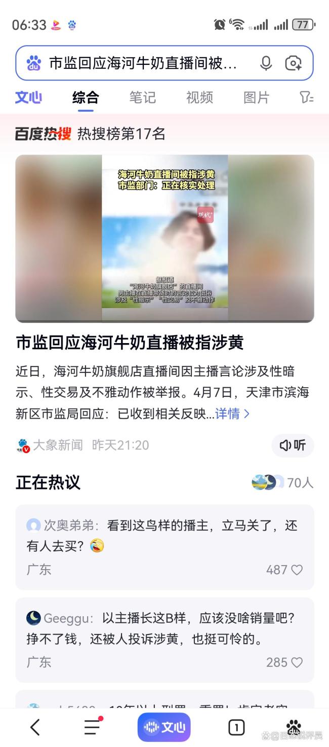 天津海河牛奶抖音直播间因涉黄内容引发广泛关注。2026年4月7日,该直播间被曝长期存在低俗言论和不雅动作,主播频繁使用性暗示词汇如“崩锅”等,导致一名六年级女童学会并询问家长这些词汇的含义。此事迅速在网络上引起公愤。涉事账号拥有14.3万粉丝,由海河牛奶授权经销商运营。起初,品牌方推诿责任,称无法管理第三方店铺,但在舆论压力下最终致歉并承诺整顿。天津市滨海新区市场监管局也已介入调查。