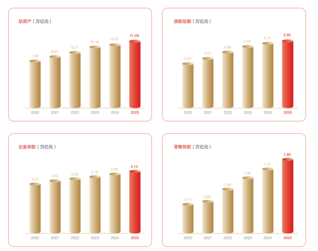 截至2025年末,兴业银行总资产达11.09万亿元,同比增长5.58%,这也是该行资产规模首次站上11万亿大关。其中,公司贷款(不含应计利息)较上年末增加2123.28亿元,增长3.7%;负债方面,截至报告期末,兴业银行总负债为101806.1亿元,同比增长5.89%。