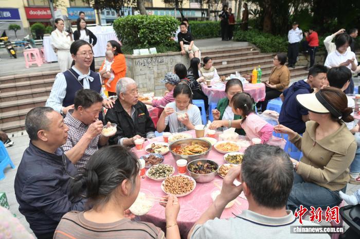 图为百家宴现场,居民边品尝美食边看文艺演出。陈鑫 摄图为百家宴现场,居民围坐品尝美食。陈鑫 摄图为百家宴现场一个“四世同堂”家庭品尝美食。陈鑫 摄图为居民现场烹饪美食。陈鑫 摄图为居民品尝美食。陈鑫 摄