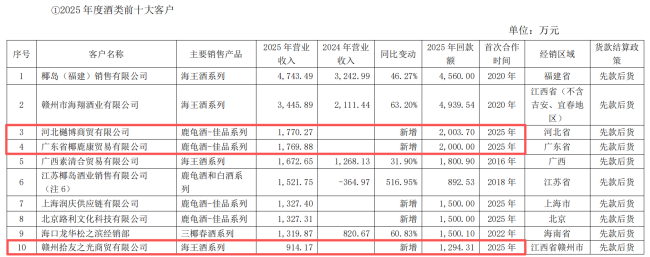 *ST椰岛饮料业务的客户结构更夸张,前十大客户几乎被新增客户和2025年新注册主体包揽。