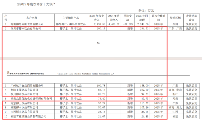 杭州椰本、南京椰上、湖南椰本、江西椰本等公司,均于2025年7至12月间注册,悉数进入*ST椰岛饮料业务前十大客户名单。