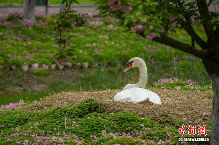 4月16日,河南郑州,随着气温回升,当地疣鼻天鹅进入孵化期。图为郑州金水河区域,疣鼻天鹅在巢中孵蛋。中新社记者 范晓恒 摄