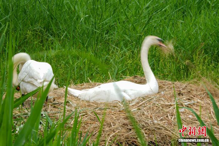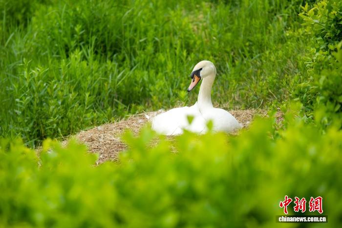 4月16日,河南郑州,随着气温回升,当地疣鼻天鹅进入孵化期。图为郑州北龙湖湿地公园,疣鼻天鹅在巢中孵蛋。中新社记者 范晓恒 摄