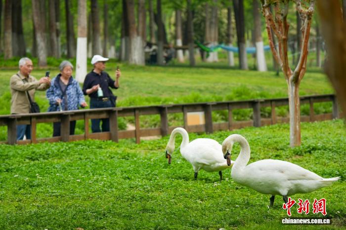 4月16日,河南郑州,随着气温回升,当地疣鼻天鹅进入孵化期。图为郑州北龙湖湿地公园,游客观赏疣鼻天鹅。中新社记者 范晓恒 摄