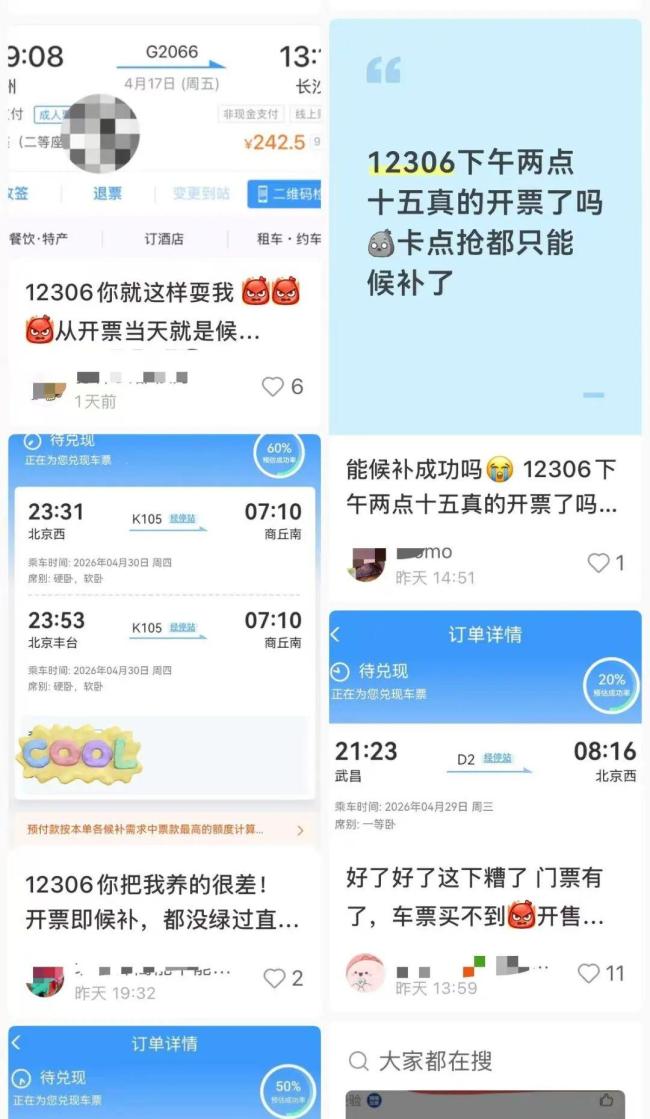 5月1日火车票今日开售。4月17日,许多网友在社交平台上表示遇到开票即候补的情况。客服提醒,如果用户提交了多个候补订单且其中一条已经兑现,其他订单因行程冲突将不再兑现。用户可以提前申请退款以避免产生手续费。