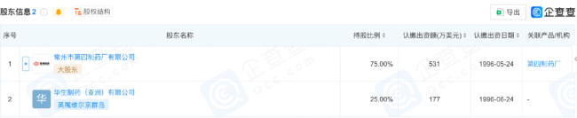 企查查显示,常州四药注册资本约4827.29万元。股权结构相对集中,大股东常州第四制药厂持股75%,剩余25%股份由外资药企华生制药(亚洲)持有。